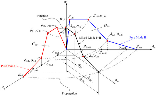 Subscript i identifies the inflection points of the cohesive law (Figure 9), and δ i m , j   ( j = I , II , III ) stand for the components of the mixed-mode displacement, δ m . For damage initiation, subscript i = 1 and δ 1 m , j   ( j = I , II , III ) are the displacement components responsible for damage onset. Equation (6) is also employed for the remaining inflection points (2, 3) in the softening region. For these three points, the equivalent relative displacements given by Equation (3) can be rewritten as,