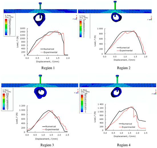 The numerical–experimental agreement for the FPB tests is then reported through P-δ (load–displacement) curves (Figure 11). The numerical curve replicates the global behavior observed experimentally, reproducing the initial stiffness and the first loading peaks satisfactorily. This leads to the conclusion that the developed model provides a reliable estimation of the damage extent in the vicinity of the used screws and the fractured region of the bone.