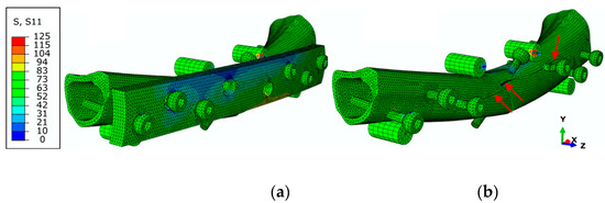 Figure 14. Normal stress field ( σ x x ) (in MPa) of the FPB finite element model showing (a) the DCP plate and (b) when hiding the DCP plate (red arrows show bone cracks in bone).