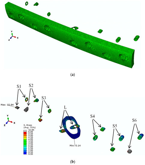 Figure 15. (a) Identification of the elements selected for stress analysis; (b) von Mises stresses at the seven screws (S1–S6 and the lag screw: L) and at the oblique fracture surface.