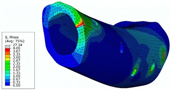 The von Mises stresses were also analyzed in the oblique fracture section (Figure 18). It can be observed that the stress field at the inferior part of the oblique section is almost null, due to the separation of bone sections in the course of the bending loading. Since bone healing requires the existence of compressive stresses along the fracture section, it can be concluded that this is a critical region regarding the restorative process. This stress distribution is governed by the applied load, which can be estimated with the developed numerical model.