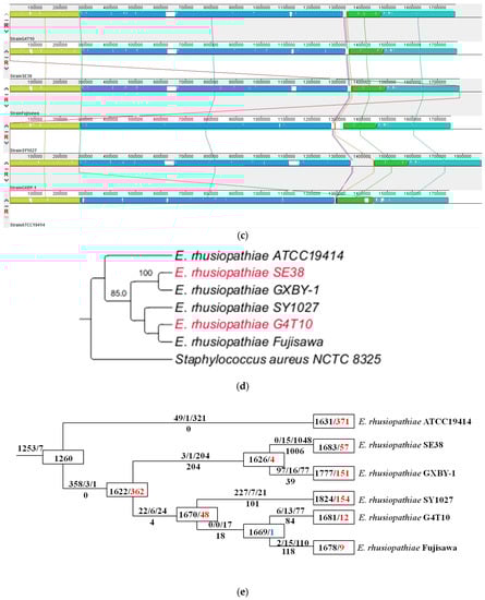Pan-genome analyses of E. rhusiopathiae. (a) Flower plots showing the core gene number (in the center) and strain-specific gene number (in the petals) of the six E. rhusiopathiae strains. (b) Pan-genome and core genome curves of the six E. rhusiopathiae strains. (c) Mauve alignment of the six E. rhusiopathiae strains. (d) Phylogenetic tree of E. rhusiopathiae strains based on the 16S rRNA gene. (e) Phylogenetic tree of E. rhusiopathiae strains based on the concatenated alignment of single-copy core genes. The numbers in boxes on every node represent the genome size and the overall balance (gain–loss: balance), with black indicating the genome size, red indicating an overall gain, and blue indicating an overall loss. The numbers above and below every lineage show the number of birth/duplication/transfer and loss events.