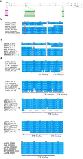 The comparative results showed that three of these twenty-five virulence genes, rspA, sbp, and spaA, were obviously different (Figure 2a). Of these, both the rspA and sbp gene were split into two short genes in strain G4T10; however, the causes of the gene split were different. The split in the rspA gene was due to a single guanine deletion (Figure 2b), compared to a single base mutation (T→G) in the sbp gene (Figure 2c). The spaA gene lost 120 bases at its C-terminal in strain G4T10 (Figure 2d). The SpaA protein in all five highly virulent strains (E. rhusiopathiae SE38, Fujisawa, GXBY-1, SY1027, and ATCC19414) contained eight C-terminal repeat units (cell wall binding, CW_binding) consisting of 20 amino acids, which is consistent with results of previous studies [,]. Each of the repeats began with the dipeptide glycine–tryptophan (GW). The eight repeats were very similar, and the fourth, fifth, and seventh repeats were identical (Figure S2). However, we detected 40 amino acids’ deletion in the SpaA protein in attenuated strain G4T10, resulting in the absence of two C-terminal repeat units (the second and the third repeats in strain SE38) compared to the five highly virulent strains. The C-terminal repeat units of the SpaA protein are necessary for the tight binding of SpaA to the bacterial surface [,]. These repeat units can attach surface proteins to the cell wall through non-covalent interactions [,]. Although spaA was transcriptionally active in both G4T10 and SE38, spaA gene expression was different (FPKM = 19.33 in G4T10 and FPKM = 96.02 in SE38). The operon organization results showed that spaA is a monocistronic gene in both G4T10 and SE38, consistent with operon DB in strain Fujisawa [].