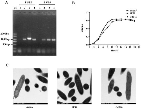 The deleted mutant strain was constructed as previously described []. DNA fragments of the spaA gene were amplified from G4T10 genomic DNA using primers ΔspaA-F and ΔspaA-R listed in Table S2, and then inserted into pSET4s to construct knockout plasmid pSET4s-ΔspaA. Next, the pSET4s-ΔspaA plasmid was electrotransformed into SE38 competent cells. The mutant strain was screened based on thermosensitive suicide and spectinomycin resistance encoded by the pSET4s vector, and then verified using two pairs of primers: P1/P2 (to detect the spaA gene) and P3/P4 (to detect the 16S rRNA gene).