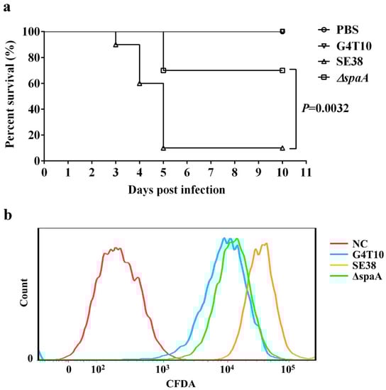 Evaluation of the virulence and adhesion ability of ΔspaA. (a) Mouse survival rate. C57BL/6 mice were subcutaneously challenged with 500 μL of attenuated strain G4T10, WT strain SE38, mutant strain ΔspaA, or PBS (10 mice/group). (b) Flow cytometry analysis. G4T10, SE38, and ΔspaA were labeled with CFDA-SE, and then co-incubated with PIECs (100:1 ratio) at 37 °C for 2 h. Flow cytometry was performed with a total of 10,000 cells counted in each group. Survival assay statistics were conducted using the log-rank (Mantel-Cox) test. All experiments were performed at least twice under similar conditions and yielded similar results.