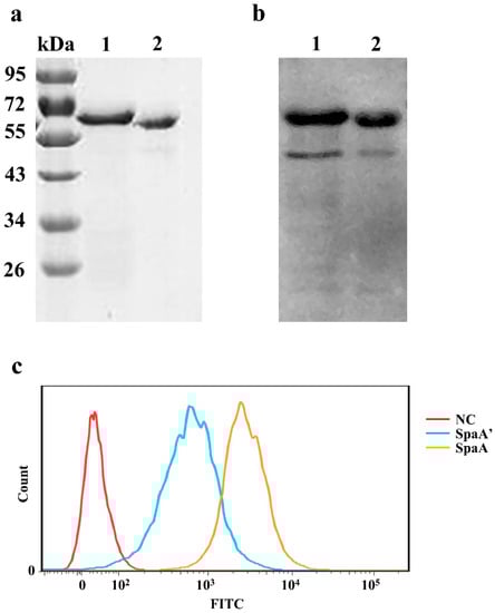 To further examine whether the deleted sequence influences the adhesive ability of SpaA, the spaA genes of SE38 and ΔspaA were cloned and expressed. The recombinant SpaA encoded by ΔspaA was named SpaA’. SDS-PAGE and Western blotting analyses showed that the molecular weight of SpaA’ was lower than that of wild-type SpaA (Figure 5a,b). Next, flow cytometry analysis was performed to determine the adhesive ability of SpaA and SpaA’ to PIECs. We observed that the adhesive ability of SpaA was significantly higher than that of SpaA’ (Figure 5c), indicating that the deleted sequence plays an important role in the adhesive ability of SpaA.