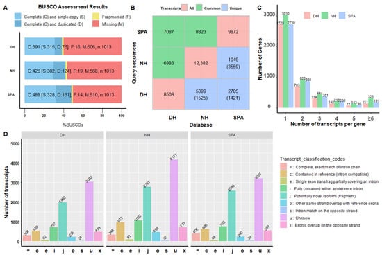 Completeness and characteristics analysis of reconstruction transcriptomes. (A) BUSCO assessment results of collapsed redundant transcripts. The Y-axis represents reconstructed transcriptome of different samples. Both the X-axis and the different colors of the box represents the proportion of different categories, including complete and single-copy, complete and duplicated, fragmented, or missing. (B) Common and unique transcripts among different transcriptomes. These diagonal, lower triangle, and upper triangle values are the number of transcript isoforms in the database, the number of unique transcript isoforms in the database (query sequences), and the number of common transcript isoforms between query sequences and the database. (C) The distribution of gene locus with different transcript isoforms number in SPA, NH, and DH. The Y-axis represents the number of genes. The X-axis represents gene locus with different isoforms. (D) Compared reconstructed transcriptomes with reference genome annotation using gffcompare v0.12.2 software. The Y-axis represents the number of genes. The X-axis and the different colors represent different categories.