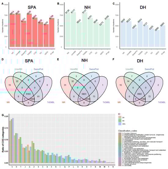 The summary of gene functional annotation using different databases. (A–C) Statistics of isoforms annotation results for SPA, NH, and DH using different databases including NR, Uniref90, Swiss-Prot, TrEMBL, COG, GO, KEGG, and PFAMs. The Y-axis represents the number of annotated isoforms. The X-axis represents different databases. (D–F) Venn diagrams showing the overlapping isoforms annotation results obtained using a different database for SPA, NH, and DH, respectively. (G) COG profiles of transcripts isoforms in SPA, NH, and DH.
