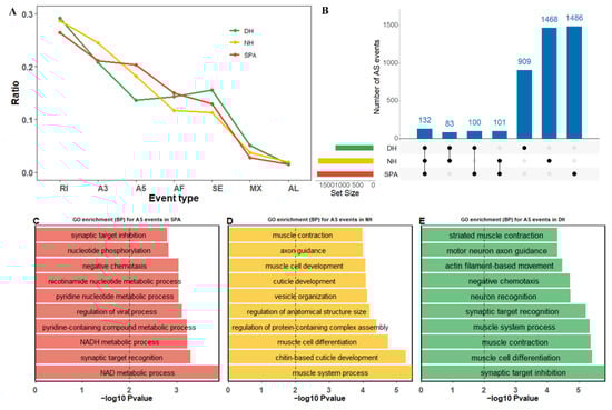 Summary of alternative splicing (AS) events profiling in SPA, NH, and DH. SPA, NH, and DH are indicated by different colors (red, yellow, and green, respectively). (A) The proportion of each AS type in SPA, NH, and DH. The Y-axis represents the proportion of different AS events. The X-axis represents different AS event types, including SE (skipped exon), MX (mutually exclusive exon), A5 (alternative 5′ splice site), A3 (alternative 3′ splice site), RI (retained intron), AF (alternative first exon), and AL (alternative last exon). (B) Identified common and specific AS events among SPA, NH, and DH. The barplots on the left represent the size of the datasets of SPA, NH, and DH. Dots and vertical lines indicate the overlapping AS events in the respective comparison. Barplots in the top panels represent the number of AS events. (C–E) The top ten significantly biological processes (BP) obtained from Gene Ontology (GO) enrichment analysis using genes with AS events in SPA, NH, and DH, respectively. The Y-axis represents different BP categories. The X-axis represents the corresponding −log10 transformed p-value.