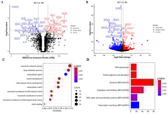 Differential expression analysis and enrichment analysis between DH and NH. (A) The volcano plot indicates p-values with minus log10-transformed for AS events (Y-axis) against their corresponding difference in inclusion levels (∆PSI) of each AS event (X-axis). The horizontal gray dotted line represents the significant threshold (0.05). The red, blue, and gray points represent up-regulated, down-regulated, and non-regulated AS events in DH groups, respectively. (B) The volcano plot indicates with minus log10-transformed for genes (Y-axis) against their corresponding log2(|fold change|) of echo gene (X-axis). (C) The top ten significant gene ontology (GO) terms obtained from GO enrichment analysis using genes with DAS events or DETs in SPA, NH, and DH, respectively. The Y-axis represents different GO term categories. The X-axis represents the proportion of significant expressed genes in the list of corresponding GO terms (GeneRatio). Different sizes and colors of circle represent the number of significantly expressed genes and corresponding adjusted p-value of GO terms. (D) The top ten significant pathways obtained from KEGG enrichment analysis using genes with DAS events or DEGs in SPA, NH, and DH, respectively. The Y axis represents different pathways categories. The X-axis represents the number of significantly expressed genes in the corresponding pathway. Different colors represent the different adjusted p-value of pathway.