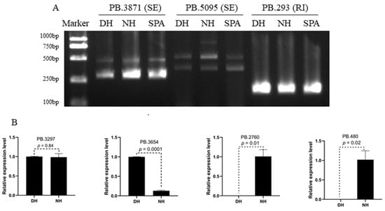 Validation of alternative splicing (AS) events and significant differential expression genes. (A) Validation of AS events by RT-PCR and agarose gel electrophoresis. (B) The relative expression level of PB.3297, PB.3654, PB.2760, and PB.480 in NH and DH.
