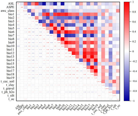 To avoid the overfitting of the results due to the high collinearity of environmental variables [31], environmental variable contribution and correlation analyses were performed based on MaxEnt and SPSS programs. We used the MaxEnt 3.4.1 program (http://biodiversityinformatics.amnh.org/open_source/maxent/, accessed on 9 October 2021) to analyze the variables’ contributions based on environmental variables and the distribution sites of Morchella, and we set the repetitions to 10 times. Next, the information on the environmental factors of Morchella was extracted using ArcGIS 10.2, and a Pearson correlation analysis was performed between environmental variables in SPSS 25 (Figure 1). Combined with the contribution of environmental factors, we retained factors with correlation coefficients under 0.8 with regard to the top six factors. A couple of environmental factors had correlation coefficient values greater than |0.8|, and only one variable with a higher contribution was retained and used in the MaxEnt models [32,33]. Finally, 18 environmental factors were used in the modeling (Table 1).