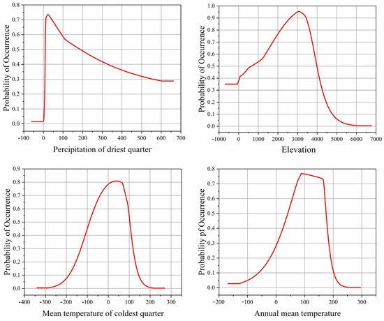 The contribution and importance of environmental variables in the distribution of Morchella species slightly differed in the different historical periods. Contribution considers the correlations between environmental variables but importance does not [47]. The results of this study show that precipitation, altitude and temperature are the main environmental factors affecting the geographical distribution of Morchella, and these results are consistent with the research results indicating that humidity and temperature are important environmental factors affecting the geographical distribution and existence probability of Batrachochytrium dendrobatidis [48]. With the Jackknife method, the impact of environmental factors on Morchella was analyzed. The total contribution of variables related to precipitation accounted for 36.5%, the total contribution of variables related to temperature accounted for 31%, and the contribution of altitude was 22.5%. Among them, the most suitable value of Bio17 for the survival of Morchella was not less than 22.15 mm, the altitude was about 3082.19 m, Bio11 was about 3.84 °C, and Bio1 was about 8.86 °C (Figure 2). If the value of these factors are too high or too low, they will affect the survival probability of Morchella. The results further indicate that Morchella is a kind of hygrophilous, low-temperature fungi, preferring a higher altitude environment, which is consistent with relevant studies [49]. At the same time, when the temperature is low, there are fewer miscellaneous bacteria and pathogens, which is conducive to the growth and development of Morchella. However, this study regarded altitude as an independent variable, and it did not consider the relationship between altitude and climatic variables, such as temperature and precipitation. Research has shown [50] that temperature, precipitation and other climatic variables are suitable at global scales and meso-scales. Terrain variables such as altitude likely affect species distribution at meso-scales. Thus, the correlations between altitude and some climatic factors, which vary over space and time, should be further explored.