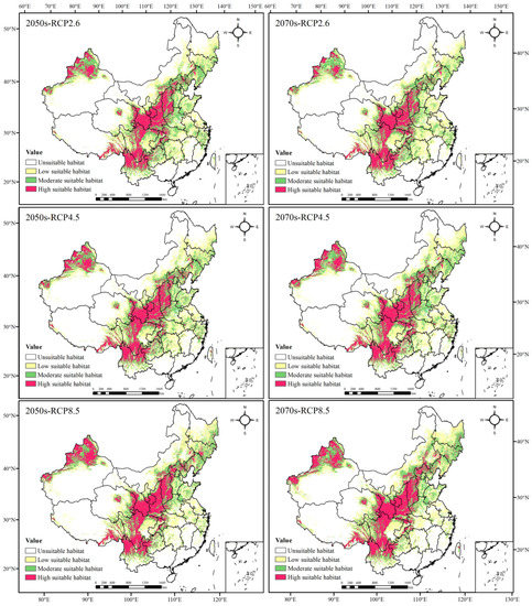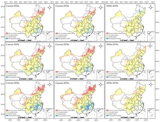 In the RCP8.5 scenario, the newly added areas in the 2050s and 2070s were mainly located in Jilin, Heilongjiang and Inner Mongolia, and they were significantly larger than those in the first two scenarios; degradation was roughly the same as that in the first two scenarios, but the scope of degradation doubled. From the 2050s to the 2070s, the newly added suitable habitat was concentrated in Xinjiang and northwest Gansu, central Inner Mongolia and southwest Heilongjiang; the degradation in habitat was mainly in Hunan, central Anhui, Southeast Sichuan and some coastal areas in the southeast.