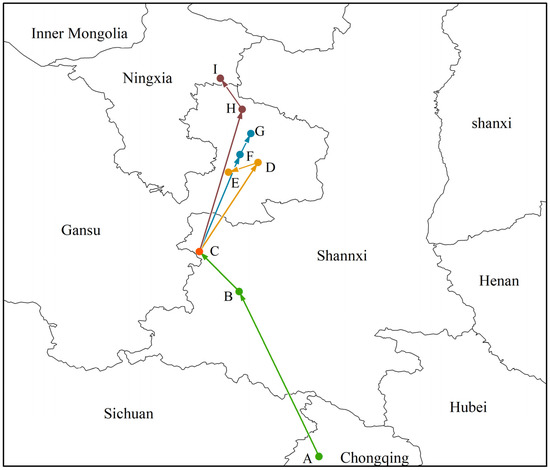 Migratory routes of potential distribution centers of Morchella in the context of climate change. Among them, the meaning of the letters were (A) LGM, (B) MH, (C) current, (D) 2050s—RCP2.6, (E) 2070s—RCP2.6, (F) 2050s—RCP4.5, (G) 2070s—RCP4.5, (H) 2050s—RCP8.5, (I) 2070s—RCP8.5.