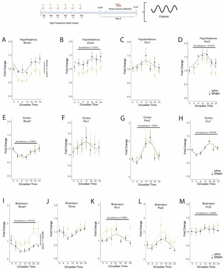 Mice were exposed to HF-HI or sham injury between ZT0 (6 a.m.)–ZT5 (11 a.m.) each day. For CCI, mice were exposed to sham or injury surgery between ZT3 (9 a.m.) and ZT6 (12 p.m.). At ZT0 on the day after the final injury day, a subset of each group of mice was euthanized by cardiac perfusion with PBS every 4 h for 24 h. For overnight data collection time points, mice were euthanized in a dark room under red light. RNA was extracted from the hypothalamus, brainstem, and cortex with TRIzol (15596026, Invitrogen, Waltham, MA, USA). The purity and concentration of the extracted RNA were determined using a NanoDrop 1000 spectrophotometer (Thermo Fisher Scientific, Waltham, MA, USA), and 1 μg of RNA was reverse transcribed into complementary DNA (cDNA) with a High-Capacity RNA-to-cDNA Reverse Transcription Kit (4368814, Applied Biosystems, Waltham, MA, USA). cDNA was diluted 1:3 using diethylpyrocarbonate-treated water before being used in RT-QPCR. RT-QPCR was quantified in triplicate using 384-well plates (4309849, Applied Biosystems) using the Prism 7900HT fast sequency detection system (Applied Biosystems). Power SYBR® Green PCR Master Mix (4367659, Applied Biosystems) was used with SYBR probes and analyzed under the following cycle conditions: 50 °C for 2 min, 95 °C for 2 min, (95 °C for 15 s, 60 °C for 15 s, 72 °C for 15 s) for 40 cycles, 95 °C for 15 s for dissociation curve. SDS 2.4 software (Applied Biosystems) was used to generate threshold cycle values (Ct), and fold change in MRNA expression was calculated with the ΔΔCt method (2−ΔΔCt). GAPDH was used as a housekeeping gene, and fold change was normalized to each group’s own expression at ZT0 (6 a.m.).