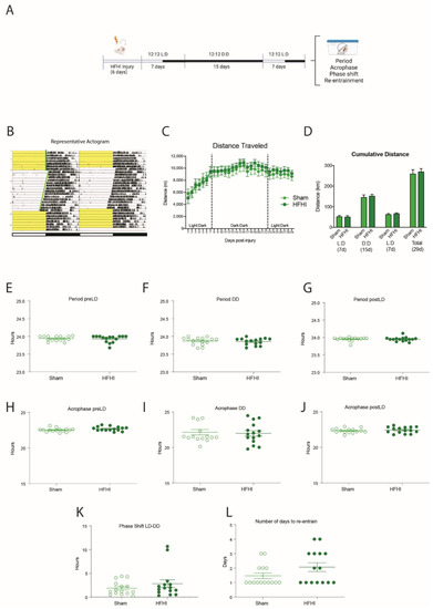 Both HFHI and sham mice were active from the first day post-injury with 5–6 km of activity. Their activity steadily increased and peaked at over 10 km per 24 h time period. There were no differences in the distance traveled between sham and HFHI in either of the light:dark phases or in the dark:dark phase (Figure 3C,D). We calculated the circadian period, the acrophase and the phase shift of the running wheel activity during the initial 7-day 12:12 L:D acclimatization time, the 15-day free-running 12:12 D:D time, and the final re-entrainment 7-day 12:12 L:D time. We found no significant differences in the circadian period (Figure 3E–G), the acrophase (Figure 3H–J), the phase shift when moving to the dark:dark cycle (Figure 3K) or the number of days to re-entrain form the dark:dark to light:dark cycles (Figure 3L).