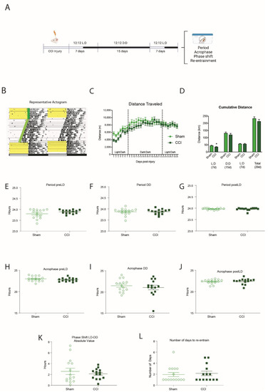 We repeated the same experiment design with CCI-injured mice. CCI mice traveled significantly less than sham mice during the first week post-injury (p = 0.022) (Figure 4B,C). However, we found no significant differences in the circadian period (Figure 4E–G), the acrophase (Figure 4H–J), the phase shift when moving to the dark:dark cycle (Figure 4K) or the number of days to re-entrain from the dark:dark to light:dark cycles (Figure 4L).