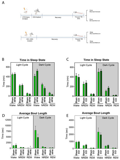 In order to characterize, compare and contrast the sleep patterns of HFHI and CCI models, we used EEG to measure all facets of sleep–wake disturbance, including sleep architecture and power analysis of brain waves post-injury. Additionally, given that circadian biology plays a key role in regulating sleep–wake cycles, we assessed sleep cycles and circadian behavior and assessed changes in the diurnal expression of circadian genes after injury.