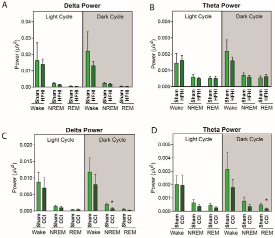 To further explore sleep architecture following TBI, we quantified power of specific frequency bands in the NREM and REM stages of sleep during the light and dark stages in CCI and HFHI mice. Following HFHI, there were no differences in the spectral power of the delta frequency band (Figure 6A) or the theta frequency band (Figure 6B). However, we found that CCI mice had a significant decrease in the spectral power for low-frequency delta and theta waves during the sleep stages. In NREM sleep in the dark phase (6 p.m.–6 a.m.) we found that CCI mice displayed a 55% reduction in delta power (p = 0.0127) (Figure 6B). We also found a 59% reduction in theta power during REM sleep during the dark phase (p = 0.032) (Figure 6D). The average power for all EEG frequency bands are available in Supplemental Tables S1 and S2.