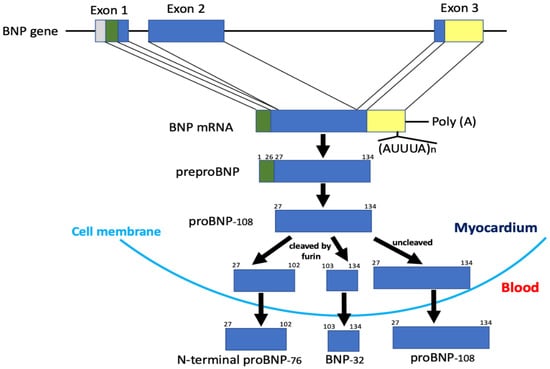Structure of the gene and biosynthetic pathway of human BNP. Note that only a portion of proBNP is cleaved in the myocardium and then proBNP, mature BNP, and N-terminal proBNP are all secreted into the blood.