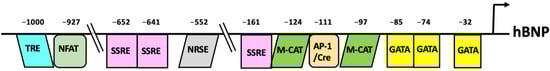 It is well known that the BNP gene expression is tissue specific and developmentally regulated. Many studies have demonstrated the importance of cis-acting elements responsible for controlling basal and inducible BNP gene transcription [44,45,46]. For example, in a study using transgenic mice, coupling a segment of the 5′-flanking region (FR) of human BNP (−1818 to +100 or −408 to +100) to the luciferase gene showed that the proximal region of the human BNP promoter is sufficient to mediate ventricle-specific expression (Figure 3) [47]. In addition, the luciferase activity of −1818hBNPluc was also larger in ventricular than atrial myocytes, and deletion analysis revealed that expression of a segment of the human BNP 5′-FR from −127 to −40 is heart-specific [48]. There are potential GATA-, M-CAT-, and AP-1/CRE-like elements in the proximal region of the human BNP promoter, which are conserved among humans, rats, and mice. These three elements regulate heart-specific gene expression and also mediate both basal and induced BNP gene expression [49]. GATA-4 regulates expression of many heart-specific genes, and mechanical stretch transiently increases GATA-4 DNA binding and transcript levels in cultured cardiac myocytes [50]. AP-1 is the binding site for the products of two proto-oncogenes, c-fos and c-jun. AP-1 binding activity is increased in an animal model of aortic coarctation-induced pressure overload in the heart [51]. A number of studies have revealed that other sites relatively distal to the human BNP 5′-FR, such as neuron-restrictive silencer element (NRSE) (−552), shear stress-responsive elements (SSRE) (−652, −641 and −161), thyroid hormone-responsive element (TRE) (−1000), and the nuclear factor of activated T-cell (NFAT) binding site (−927), are also involved in the inducible activation of the human BNP promoter [44,49,52]. SSRE, located in the proximal promotor at the −161-bp, −641-bp, and −652-bp positions, is thought to be partly responsible for the induction of human BNP by mechanical stress. Single or multiple site-directed mutations of SSRE elements or co-transfection with a constitutive suppressor of NF-kB activity caused a maximum 40% decrease in strain-activated human BNP promotor activity [53]. Among these elements, the transcriptional repressor element NRSE, located at −552 of the human BNP promoter represses basal BNP promoter activity and mediates cardiac hypertrophic signaling induced by fibronectin [54]. Neuron restrictive-silencer factor (NRSF) binds to NRSE, thereby repressing promoter activity. Moreover, heart-restricted inactivation of NRSF by over expression of a dominant-negative NRSF driven by the cardiac-specific α-MHC promoter increased mRNA expression of ANP and BNP in the ventricle and induced cardiac dysfunction and sudden death, which confirms the importance of NRSF in the molecular mechanism of failing heart [55]. Thus, under normal conditions, NRSF suppresses the fetal myocardial gene program, thereby inhibiting maladaptive cardiac remodeling. However, a recent study showed that under pathological conditions NRSF nuclear repressor function is attenuated by CaMKII-dependent phosphorylation of class II HDAC54, allowing reactivation of the fetal cellular gene program [56]. In addition, cardiac expression of Gαo, an inhibitory G protein encoded in humans by GNAO1, which is transcriptionally regulated by NRSF, was increased in the ventricles of several heart failure models [56].