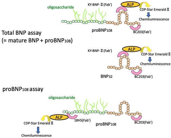 Schematic diagram of the total BNP and proBNP assay systems. BC203, a monoclonal antibody that specifically recognizes the C-terminus of BNP, is used as a capture antibody for both total BNP and proBNP. KY-BNP-II (Fab’), a monoclonal antibody that specifically recognizes the ring structure of BNP, is used as a detection antibody for total BNP assay. 18H5 (Fab’), a monoclonal antibody that specifically recognizes the N-terminus of proBNP, is used as a detection antibody for proBNP assay. ALP: Alkaline phosphatase; CDP-Star EmeraldII (Chemiluminescent Substrate): Disodium2-chloro-5-(4-methoxy-spiro{1,2-dioxetane-3,2′-(5′-chloro)-tricyclo[3,3,1,13,7]decan}-4-yl)-1-phenyl phosphate.