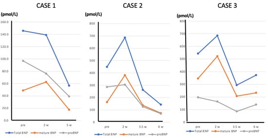 Line graphs showing the changes in total BNP, mature BNP, and proBNP in Cases 1, 2, and 3 before and after initiating ARNI administration.