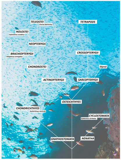 The actual biodiversity of fish fauna is the result of a long evolutionary history that began over 500 million years ago which saw the emergence and extinction of different groups of fishes until the establishment of the currently dominant group of bony fishes, the teleosts. The first fishes, known as Ostracoderms, did not have mandibles (Agnatha), and their bodies, which were small and generally flattened, were covered by bony plates. The descendants of the Ostracoderms are the current lampreys and myxines. The filter-feeding habits were then abandoned to switch to mechanisms of active predation towards larger organisms, with the appearance of the jaws (Gnathostoma). This latter includes Chondrichthyes, or cartilaginous fishes, derived from Placoderms [22] and Osteichthyes, or bony fishes. The phylogeny of bony fishes has two evolutionary lines, Actinopterygii and Sarcopterygii. From the Sarcopterygii evolved the Crossopterygii, from which the tetrapod originated. The Actinopterygii have given rise to the present great diversity of fish species. The Polypterus senegalus, which is the living species with the most primitive characteristics of Actinopterygii [23], has kept functioning lungs, as well as the Dipnoi among the Sarcopterygii. The Actinopterygii is divided into the Chondrostei, which includes, among others, the sturgeons, and the Neopterygii, which comprises most of the current orders. The Neopterygii includes Holostei and Teleostei. Of the former, the Lepisosteiformes (spotted gar) and the Amiiformes (bowfin) still survive. The teleosts represent today the most diversified group of vertebrates, with about 21.000 species adapted to the most disparate environments [24,25,26] (Figure 1).