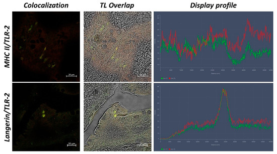 Colocalization of Langerin/CD207 and TLR-2, 40×, scale bar 20 µm. The colocalization of Langerin (green) and TLR-2 (red) is evident (arrows). Overlap in Transmitted Light (TL) is used to compare the organ morphology. The “display profile” function was used to confirm the antibodies colocalization.