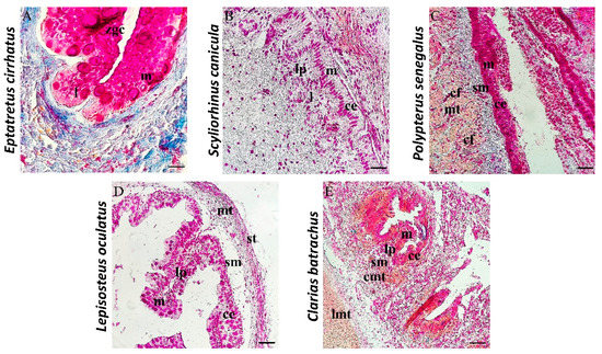 Sections of intestine stained with Mallory Trichrome, 40×, scale bars 40 µm. (A) Mucosa (m), submucosa (sm), and Muscolaris serosa (ms) are the three layers of the gut of Eptatretus cirrhatus. The mucosa is arranged in zigzag ridges, with evident zimogenous cells (zgc), and scattered immune cells (l). (B) The intestine of Scyliorhinus canicula is separated into mucosa, submucosa, muscolaris, and serosa. The mucosa is organized in folds that are virtually obliquely oriented. A columnar epithelium (ce) of enterocytes forms the mucous layer (m). Scattered immune cells (l) are evident in lamina propria (lp). (C) The gut of Polypterus senegalus presents a mucosa (m) with columnar epithelium (ce), submucosa (sm), muscolaris (mt), and serosa (st). The mucous layer of the intestine shows goblet cells and columnar epithelial cells (ce). The thickness of the submucosa contains collagen fibers (cfs). (D) There are four strata in the gut of Lepisosteus oculatus: mucosa (m), submucosa (sm), muscolaris (st), and serosa (st). In the mucosa, longitudinal folds and a columnar epithelium (ce) accompanied by goblet cells can be seen. (E) The intestine of Clarias batrachus morphologically shows four laminae: mucosa (m), submucosa (sm), muscolaris (mt), and serosa (st). The mucosa of the intestine is folded and has a columnar epithelium (ce) comprising enterocytes and mucipar caliciform cells. Muscularis is organized in longitudinal (lmt) and circular (cmt).