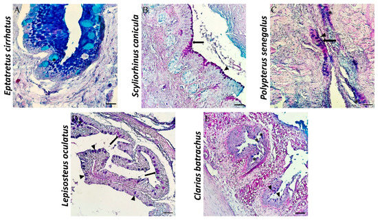 Sections of intestine stained with AB/PAS, 40×, scale bar 40 µm. (A) In the intestine of Eptatretus cirrhatus, mucous cells according to the type of secretion (acid in blue, neutral in magenta, and mixed in purple) can be distinguished. Staining highlights several mucous cells with an ovoid shape in blue (*) with acidophilic secretion. (B) Two mucous cell populations, neutral mucous (magenta) (arrows) and mixed secretion mucous cells (neutral and acid) (purple) (arrowheads), were detected in the intestine of Scyliorhinus canicula. (C) Mucous cells are abundant and can take different forms, namely ovoid, columnar, or pear-shaped, in the intestine of Polypterus senegalus. The presence of all three types of mucins (acidic, neutral, and mixed) is evident. (D) In sections of the intestine of Lepisosteus oculatus, the mucous secretion shows the presence of acidic, neutral, and mixed mucins. (E) The mucous cells on the apex of the intestinal crests of Clarias batrachus are strongly positive for AB/PAS histochemical staining, demonstrating the presence of acidic, neutral, and mixed mucins.