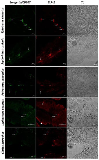 Immunofluorescence of Langerin/CD207 and TLR-2, 40×, scale bar 20 µm. The immunopositivity to Langerin/CD207 (green) and TLR-2 (red) is evident in the mucosa (Polypterus senegalus, Lepisosteus oculatus, and Clarias batrachus) and submucosa (Eptatretus cirrhatus, Scyliorhinus canicula, and Clarias batrachus) (arrows). Some scattered immune cells (*) TLR-2 positive in the gut of Lepisosteus oculatus is detected. Enterocytes (arrowhead) are positive for TLR-2 in the intestine of Lepisosteus oculatus. Transmitted Light (TL) is used to compare the organ morphology.