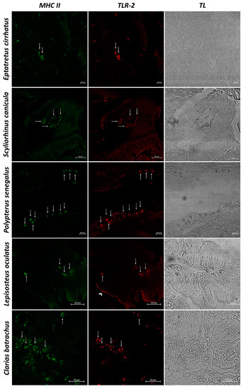 Immunofluorescence of MHC II and TLR-2, 40×, scale bar 20 µm. The immunopositivity to MHC II (green) and TLR-2 (red) is evident in the mucosa (Polypterus senegalus, Lepisosteus oculatus, and Clarias batrachus), lamina propria (Scyliorhinus canicula), and submucosa (Eptatretus cirrhatus) (arrows). Enterocytes (arrowhead) are positive for TLR-2 in the intestine of Lepisosteus. Transmitted Light (TL) is used to compare the organ morphology.