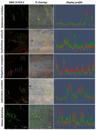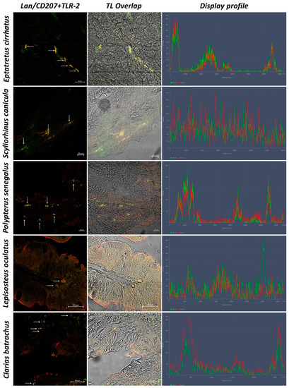In sections of intestinal tissue of Eptatretus cirrhatus, DC-like cells positive to Langerin/CD207, MHC II, and TLR-2 are evident in the submucosa (Figure 5 and Figure 6). Scyliorhinus canicula has similar DCs, which are positive for the antibodies tested in the submucosa. Positive DC-like cells to MHC II/TLR-2 in the lamina propria are evident (Figure 5 and Figure 6). Sections of the intestine of Polypterus senegalus show the immunoreactivity of Langerin/CD207, MHC II, and TLR-2 positive cells in the mucosa (Figure 5 and Figure 7). Immunopositivity to the same antibodies is evident in the mucosa of the intestine of Lepisosteus oculatus (Figure 5 and Figure 6). Langerin/CD207, MHC II, and TLR-2 positive DCs are also identified in the mucosa and submucosa of the intestine of Clarias batrachus (Figure 5 and Figure 6). In all tissues, there is strong colocalization, as also confirmed by the graphs obtained with the “display profile” function by confocal microscope (Figure 7 and Figure 8).