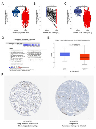 MNDA is down-regulated in LA. (A) Unpaired analysis showed that the mRNA expression level of MNDA in LA was significantly lower than that in normal tissues (Normal = 59, Tumor = 535, p = 7.7 × 10−25). (B) Paired analysis showed that the mRNA expression level of MNDA in LA was significantly lower than that in normal tissues (Normal = 57, Tumor = 57, p = 6.7 × 10−13). (C) Comparison of mRNA expression levels of MNDA in NSCLC and normal lung tissues (Normal = 108, Tumor = 1037, p = 7.7 × 10−51). (D) Comparative analysis of MNDA expression in 11 LA studies in the Oncomine database. (E) The protein expression of MNDA in LA from CPATC samples in the UALCAN database was analyzed. (F) Comparison of immunohistochemical staining for MNDA in LA and lung normal tissue from the HPA.