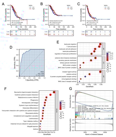 Prognosis and functional analysis of MNDA. (A) The high expression of MNDA was associated with good overall survival rate. (B) The high expression of MNDA was associated with good disease-specific survival. (C) The prognostic effect of MNDA on progress-free interval was analyzed. (D) ROC analysis evaluated the value of MNDA as an indicator for distinguishing normal lung tissue samples from LA samples. (E) GO analysis enriched BP, CC and MF involved in significantly different genes between MNDA high and low expression groups in LA. (F) KEGG analysis enriched signaling pathways between MNDA high and low expression groups in LA. (G) GSEA was performed to determine differences in signaling pathways between low- and high-expressing MNDA groups in LA.