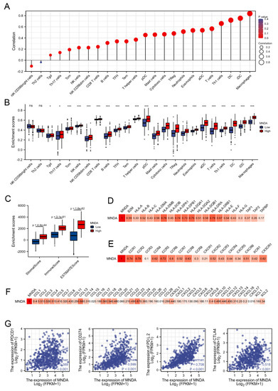 To verify the role of MNDA in the activation of immune cells, we used the ssGSEA algorithm in the GSVA package [18,22] to analyze the correlation between MNDA and 24 immune cells, and the results showed that the correlation coefficient of MNDA and macrophages was the highest, which is consistent with the immunohistochemical results for LA in the human ALTAS database (Figure 3A). In addition, ssGSEA analysis also showed that aDC (activated DC); B cells; CD8 T cells; cytotoxic cells; DC; eosinophils; iDC (immature DC); macrophages; mast cells; neutrophils; NK CD56dim cells; NK cells; pDC (plasmacytoid DC); T cells; T helper cells; Tcm (T central memory); Tem (T effector memory); Tfh (T follicular helper); Tgd (T gamma delta); Th1 cells; Th17 cells; and Treg had higher enrichment scores in the MNDA high expression group (Figure 3B). Similarly, StromalScore, ImmuneScore and ESTIMATEScore also had higher enrichment scores in the MNDA high expression group (Figure 3C). We then analyzed the correlation of MNDA with chemokines, chemokine receptors, and MHC molecules. The results showed that MNDA was significantly correlated with chemokines, chemokine receptors, and MHC molecules, which confirmed the results of GO analysis and KEGG analysis (Figure 3D, E, F). Unexpectedly, however, immune checkpoint genes were also significantly positively correlated with MNDA, which is contrary to the function of MNDA that may activate immunity (Figure 3G). The reason for this result may be that MNDA and immune checkpoint genes have a certain cooperative expression pattern.
