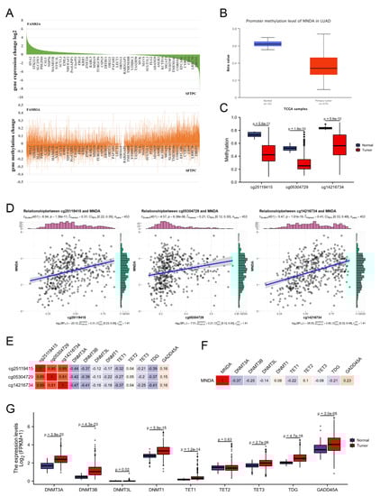 Abnormal DNA methylation level of MNDA in LA. (A) Ranking analysis of significantly differential genes and methylation change of significantly differential genes in LA. (B) Comparison of promoter methylation levels of MNDA between tumor and normal samples. (C) Comparison of methylation levels at MNDA methylation sites between LA and normal samples. (D) Correlation analysis of MNDA methylation sites cg05304729, cg25119415, and cg14216734 with MNDA mRNA expression. (E) Correlation analysis of DNA methylation and demethylation regulators with MNDA methylation sites cg05304729, cg25119415, and cg14216734 in LA. (F) Correlation analysis between DNA methylation and demethylation regulators and MNDA in LA. (G) Comparison of DNA methylation and demethylation modulators between LA and normal samples.