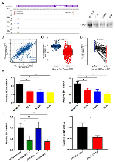 Transcription factor SPI1 regulates the expression of MNDA. (A) SPI1 has obvious binding capacity near the transcription initiation site of MNDA. (B) Positive correlation between SPI1 and MNDA mRNA expression. (C) Unpaired analysis showed that the mRNA expression level of SPI1 in LA was significantly lower than that in normal tissues (normal = 59, tumor = 535, p = 3 × 10−27). (D) Paired analysis showed that the mRNA expression level of MNDA in LA was significantly lower than that in normal tissues (normal = 57, tumor = 57). (E) qPCR detection of MNDA and SPI1 in LA cell lines H1299, PC9 and A549, and compared with normal lung cell line Beas-2b. (F) qPCR detection of MNDA and SPI1 after down-regulation of SPI1 (* p < 0.05 and ** p < 0.01, ).