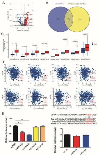 The target miRNAs of MNDA were significantly up-regulated in LA. (A) Volcano plot of miRNA expression changes in TCGA-LUAD. (B). Wayne analysis of significantly different miRNAs in TCGA-LUAD versus target miRNAs predicted by MNDA. (C) The expression of the eight miRNAs in LA. (D) Correlation analysis of MNDA with eight target miRNAs. (E) Luciferase reporter assay was performed to validate relationship between MNDA and miRNAs (n = 4). hsa-miR-33a-5p and hsa-miR-33b-5p strikingly suppressed the luciferase activities of the MNDA-WT reporter vector. The inhibitions of hsa-miR-33a-5p and hsa-miR-33b-5p on luciferase activities were abrogated by the MNDA-MUT reporter vector. ** p < 0.01 and * p < 0,05 vs. miR-NC.
