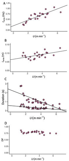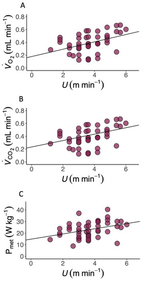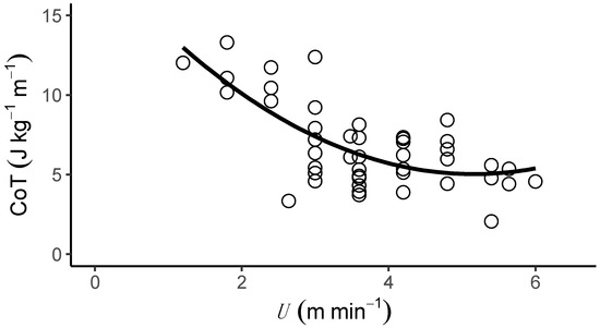 All statistical analyses (Table 1) were performed using R statistical software (version 3.6.2, R Core Team 2020, http://www.R-project.org/, Vienna, Austria, accessed on 15 June 2021). The Akaike Information Criterion (AIC) was used to determine the line of best fit for the relationship between CoT and U. The effects of U on the kinematic parameters (lstride, fstride, tstance, tswing, DF) and energetics (, , Pmet, RER) were tested using regression. All analyses (except mass-specific Pmet and CoT) included mass as a proxy for individual effects to test individual effects on each dependent variable, as well as to consider any interactions between mass and U. In cases with no interaction between the independent variables, mass was removed from the test and the regression was conducted again with only U and the dependent variable. Statistical differences were considered significant when p < 0.05 and r2 values are adjusted. All data mean values are displayed ± standard error (SE). Processed summary energetics and kinematics datasets can be found in the electronic Supplementary Materials.