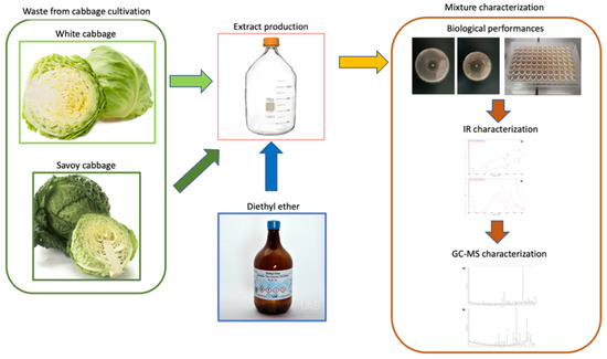 The white cabbages and savoy cabbages purchased from the local market were extracted by a solvent extraction and a liquid–liquid purification approach without the aid of temperature and pressure to avoid any kind of degradation of the molecules extracted. The extracts were extensively characterized using FT-IR and GC-MS analyses. Meanwhile, the biological activity was evaluated and quantified by antifungal and antibacterial assays together with the determination of minimal inhibitory concentration (MIC).