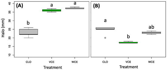 Antifungal assay results, using the disk diffusion method (halo diameter (mm)) from extracts obtained from Savoy cabbage (green box, VCE) and white cabbage (white box, WCE) induced in C. albicans ATCC 14053 (A) and C. glabrata ATCC 15126 (B) compared with Clotrimazole (Grey-CLO). Different letters above the bars indicate significant differences, according to Kruskal-Wallis followed by Nemenyi’s post hoc test (p-value cutoff = 0.05).