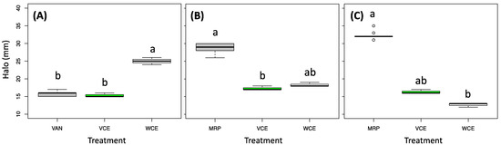 Antibacterial assay results using the disk diffusion method (halo diameter (mm)) from extracts obtained from Savoy cabbage (green box, VCE) and white cabbage (white box, WCE) induced in S. aureus NCTC6571 (A), P. aeruginosa ATCC27853 (B), and K. pneumoniae ATCC13883 (C) compared with the reference antibiotic drug (grey): vancomycin (VAN) and meropenem (MRP). Different letters above the bars indicate significant differences, according to Kruskal–Wallis followed by Nemenyi’s post-hoc test (p-value cutoff = 0.05).