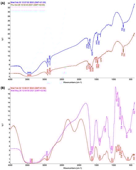 FT-IR spectra of formulations extracted from savoy cabbage (blue pattern) and white cabbage (red pattern) are reported in Figure 4. In particular, in Figure 4A, the results related to the biologically active fraction of the obtained mixture are presented, while in Figure 4B, spectral data are reported for the recovered inactive byproducts. In Figure 4A, the two spectra indeed show a closely similar profile, which suggests a related composition extracted from the savoy and white cabbages. Considering that cabbages of different varieties produced in different years and in different production sites were processed, the spectral profile obtained, almost overlapping, guarantees that the extraction method, although unconventional, yields a biologically active fraction in a highly reproducible way.