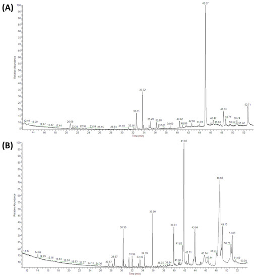 A typical chromatogram obtained by GC-MS is reported in Figure 5. The extracts from the two cabbages contain several volatile (molecules present in the first part of the chromatograms at low retention time values) and semivolatile molecules (molecules with higher retention time). The chromatographic peaks’ identification was performed by a comparison of the spectra recorded with the Wiley spectra library with the criterion of almost 40% matching probability.
