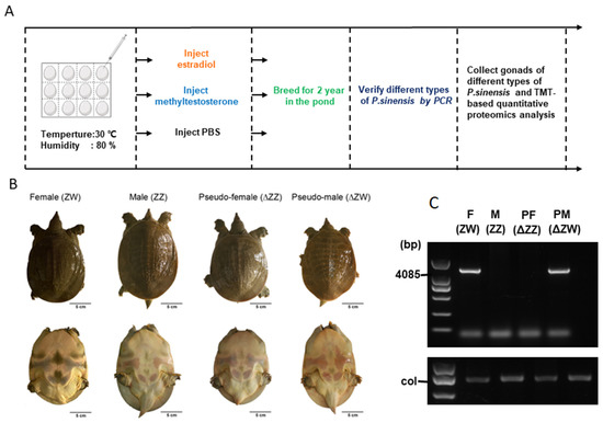 Acquisition of pseudo-female and -male of Chinese soft-shelled turtles. (A) The basic workflow of this experiment. (B) Appearances of the four types of Chinese soft-shelled turtles. (C) Verification of the four types of Chinese soft-shelled turtles. F: female, M: male, PF: pseudo-female, PM: pseudo-male, PBS: phosphate-buffered saline, PCR: polymerase chain reaction, TMT: tandem mass tag.
