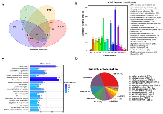 Functional annotation analysis of all samples. (A) Wayne analysis of annotated proteins using different databases. (B) COG functional classification of all matched proteins. (C) IPR annotation analysis of all samples. (D) The subcellular localization of all samples. GO gene ontology, COG: Cluster of Orthologous Groups, IPR: InterPro, KEGG: Kyoto Encyclopedia of Genes and Genomes.