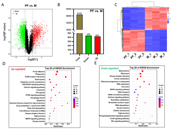 Analysis of differentially abundant proteins analysis between males and pseudo-females. (A) The differentially abundant proteins between pseudo-females and males. (B) The number of differentially abundant proteins between pseudo-females and males. (C) Cluster analysis of differentially abundant proteins between males and pseudo-females. (D) Top 20 enriched signaling pathways of upregulated proteins between pseudo-females and males. (E) Top 20 enriched signaling pathways of downregulated proteins between pseudo-females and males.